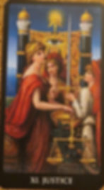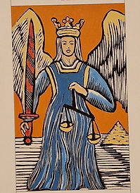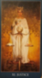 Justice points out that laws and morals do not depend solely on the subjective opinion of an individual, but instead stem from a greater universal or karmic source. The scales depicted in the Justice card indicates the balance of opposites - head versus heart, matter versus spirit and consciousness versus unconsciousness. They also reflect the ability to assess and distinguish right from wrong. Justice's sword points towards higher thinking and symbolises the ability to act and to recognise what is just and what is unjust.