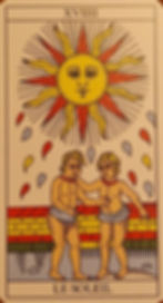 Marseille The MArseille Sun card depicts two children dancing, one of them dressed in blue and the other in red. The sun's rays shower down upon their bare shoulders.