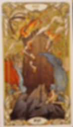 A stone arch embedded with skulls is struck by lightning and falls down. The Tower represents solitude, the removal of oneself from the world.