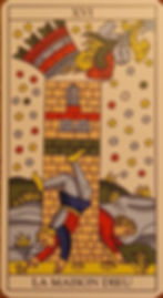Marseille and Radiant Wise Spirit: The Marseille and Radiant Wise Spirit Tower cards depict a crumbling building under attack from a flame shooting out of the sky. Two people are seen plunging from the Tower to the ground, and spots of various colours tumble from the sky, symbolizing chaos and destruction.